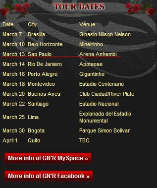 Segundo o site oficial (www.gunsnroses.com) do GNR o show em São Paulo que acontecerá no dia 13 de março, foi mudado do Palestra Itália para a Arena Anhembi. No MySpace e Facebook oficiais do GNR o local do show ainda é o Palestra Itália.