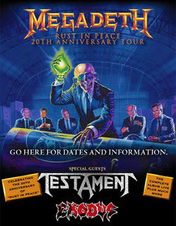 Depois da confirmação da volta de David Ellefson, o Megadeth começou sua turnê em comemoração ao 20º aniversário do clássico Rust in Peace, um dos álbuns mais influentes da história doi Thrash Metal, o tocando na integra. E o Brasil foi confirmado na turnê, tocando dia 20 de Abril em Recife no Centro de Convenções, dia 22 em Brasília no Ginásio Nilson Nelson, dia 24 em São Paulo Credicard Hall e dia 26 de Abril em Porto Alegre no Pepsi Stage, com a pré-venda exclusiva para a apresentação em São Paulo começando dia 12/03 e as bilheterias sendo abertas para o público dia 19/03. Até agora, somente o país de origem da banda, EUA, e o Brasil vão ver essas apresentações exclusivas de comemoração ao Rust in Peace. No meio do ano a banda parte para a Europa nos festivais de verão mesclando junto apresentações da turnê Big Four e depois volta aos EUA numa turnê ao lado de Testament e Slayer (chamada American CArnage). A Rust in Peace 20th Anniversary Tour tem o suporte do Testament e do Exodus, porém ainda não foi confimado a vinda das duas bandas ao Brasil.