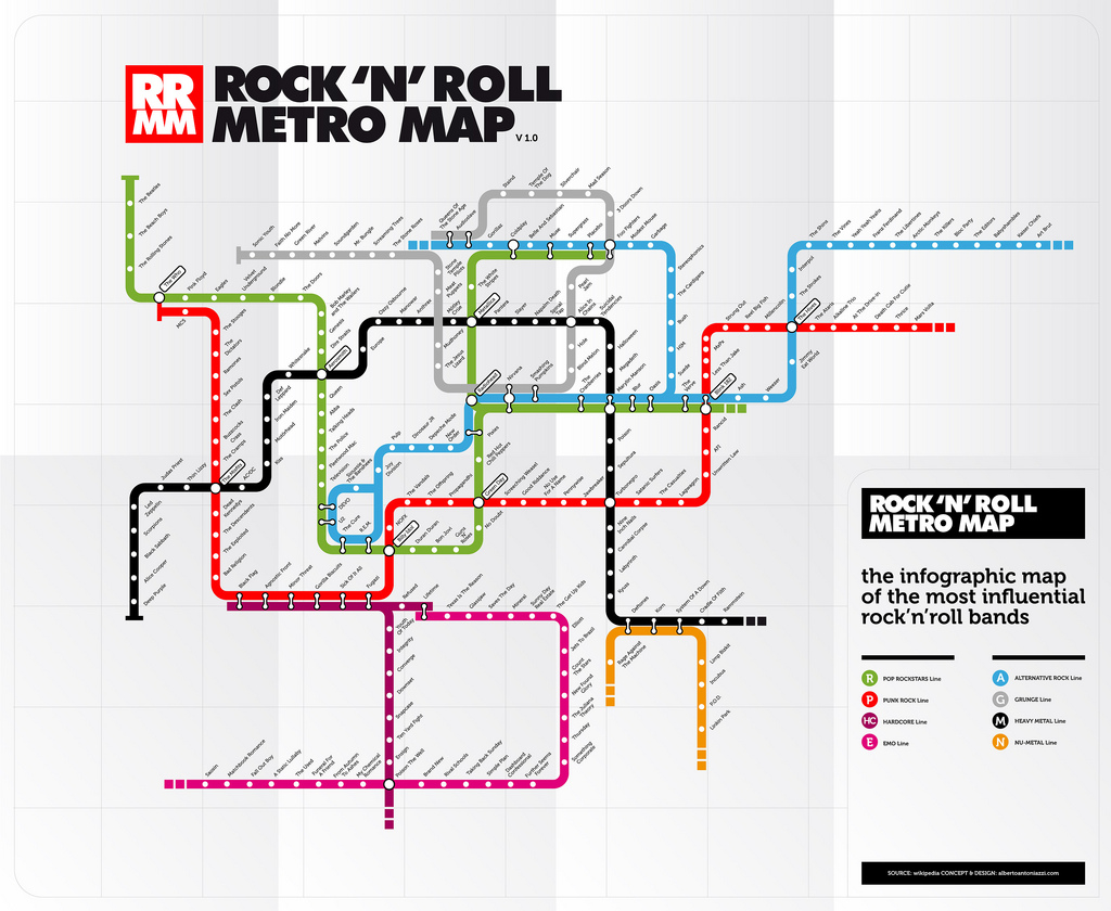 Alberto Antoniazzi, atualmente designer na MTV Itália, fez um mapa do metrô com as bandas de rock mais influentes do mundo. Ele inclusive tentou representar nas conexões os gêneros do rock que se misturam.
