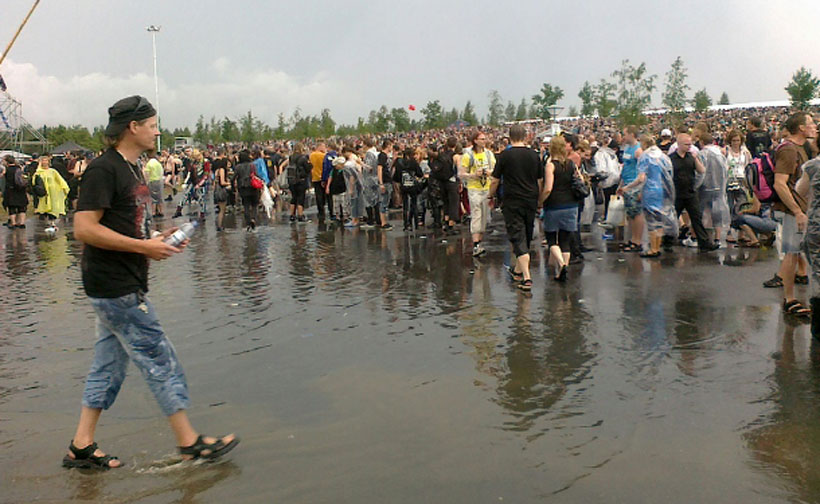 Após a edição sueca do Sonisphere Festival ter tido problemas com a chuva na noite de sábado, o dia seguinte reservava o pior para a edição finlandesa do evento, que acontece na cidade de Pori. Diversas pessoas ficaram feridas após uma repentina chuva de granizo que resultou na queda de parte da estrutura do palco e danos em estandes e barracas. Segundo as agências de notícias, foram mais de 40 feridos, sendo dois em estado grave.