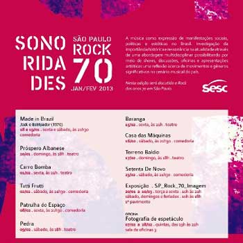 Em janeiro e fevereiro, o Sesc Belenzinho promove o projeto “Sonoridades – São Paulo Rock 70?. Essa é a segunda edição do projeto, que traz, além de uma programação de shows (R$ 24), uma exposição sobre as bandas e artistas que definiram uma estética que consolidou o rock no Brasil nessa década. A exposição “SP Rock 70 Imagem”, com curadoria de Moisés Santana, abre no dia 19 de janeiro e segue até março. A mostra exibe fotos das bandas e capas de seus discos na São Paulo dos anos 1970. Entre os fotógrafos estão Ana Arantes, Antonio Freitas, Carlos Hyra, Flavia Lobo, Hermano Penna, Leila Lisboa, Márcia Rebello, Mario Luiz Thompson e Vania Toledo.