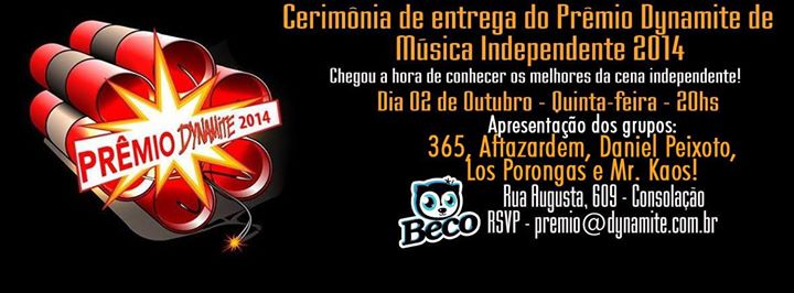 Acontece amanhã, quinta dia 02 de outubro de 2014 a cerimônia de entrega do Prêmio Dynamite de Música Independente que será realizada, a partir das 20hs no Beco 203 - São Paulo, na Rua Augusta em em São Paulo.