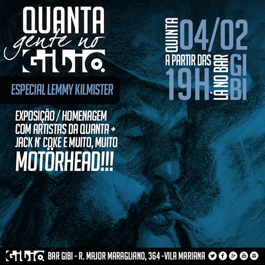 Localizado no bairro de Vila Mariana, em São Paulo, o bar Gibi - Cultura Geek realiza periodicamente o "Quanta Gente No Gibi", o 'drink and draw' da Quanta Academia de Artes. Na próxima quinta-feira (04), a partir das 19h, o saudoso Lemmy Kilmister, a alma do Motörhead, será o foco do primeiro Quanta Gente no Gibi de 2016. "Abriremos uma exposição com trabalhos inéditos dos artistas da Quanta. Durante a noite, o Gibi exibirá o documentário 'Lemmy' de 2010 e a bebida da vez é o Jack and Coke, claro!", destaca o proprietário Tiago Almeida.