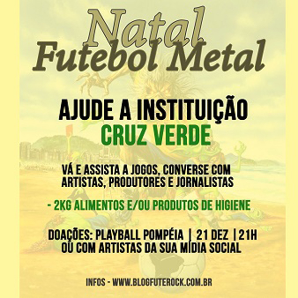 Um grupo de músicos, jornalistas e produtores, que jogam futebol o ano todo, farão amanhã, 21/12, na Palyball Pompéia, a partir das 21:00hs, o Natal Metal Solidário, unindo assim o futebol com uma ação social, que irá arrecadar alimentos e produtos de higiene para a Associação Cruz Verde.