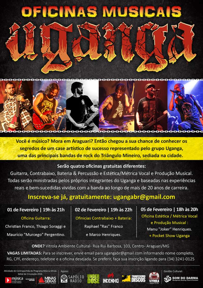 Como contrapartida ao incentivo recebido pelo Música Minas, os seis integrantes do Uganga realizam nesta semana em Araguari, no Triângulo Mineiro, uma série de oficinas musicais. Serão quatro oficinas gratuitas diferentes: Guitarra, Contrabaixo, Bateria & Percussão e Estética/Métrica Vocal e Produção Musical. Todas serão ministradas pelos próprios integrantes do Uganga e baseadas nas experiências reais e bem-sucedidas vividas com a banda ao longo de mais de 20 anos de carreira.