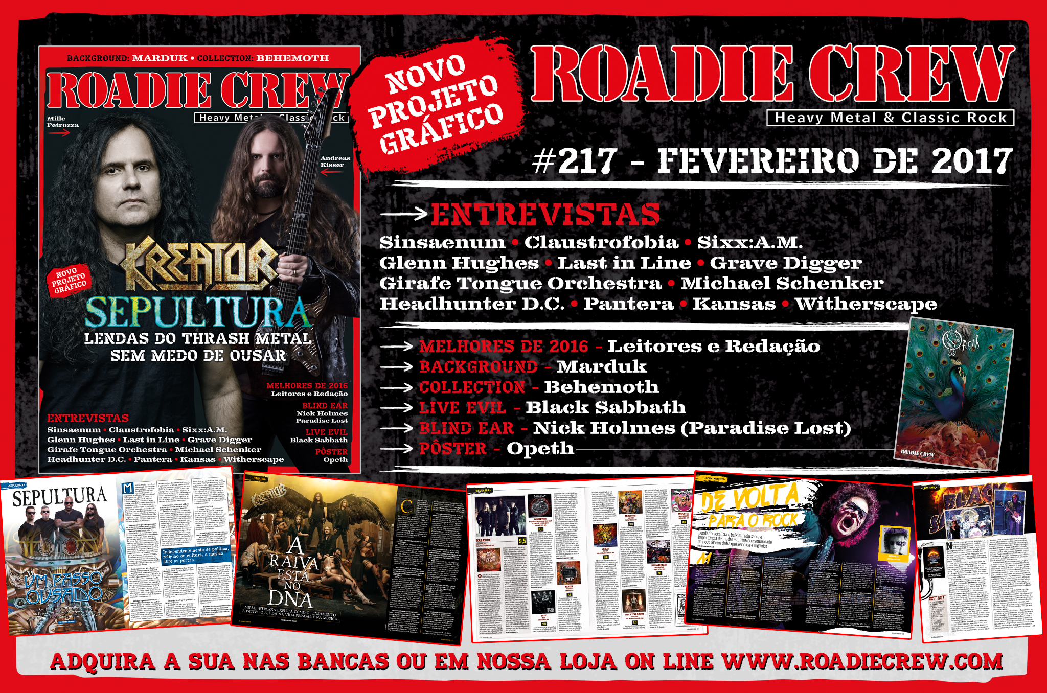 Com novo projeto gráfico dando uma cara totalmente diferente para a publicação, a edição #217 (fevereiro, 2017) da revista Roadie Crew, que estará nas bancas de todo o Brasil até o dia 10 de fevereiro, traz nos destaques de capa as bandas Kreator e Sepultura, que falam sobre seus mais recentes trabalhos de estúdio – "Gods of Violence" e "Machine Messiah", respectivamente. Os lendários grupos de Thrash Metal, que atualmente estão excursionando juntos pela Europa, também falam sobre fatos da carreira.