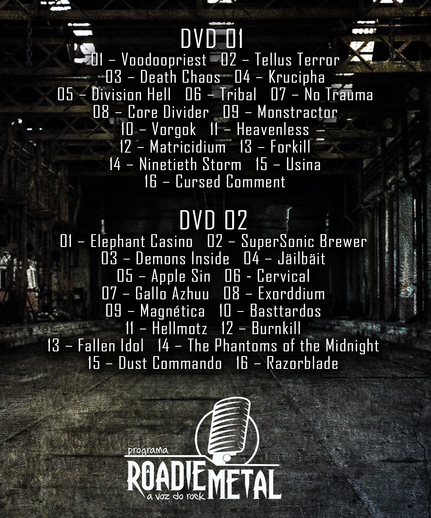 Lançado oficialmente no último dia 19 de maio, o primeiro DVD de clipes da história do Metal Nacional, apresenta 34 bandas de vários estilos com ideias e conceitos visuais incríveis, nossa ideia é levar ate o público, imprensa, produtores e casas de shows, toda a qualidade individual de cada banda no DVD Roadie Metal Vol.01.