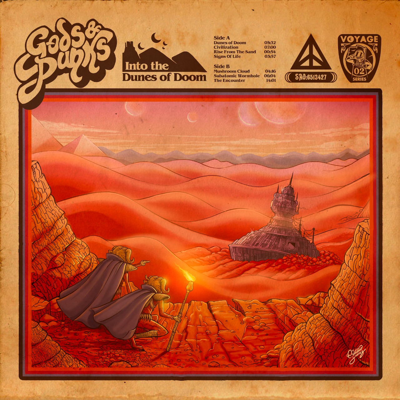 'Into the Dunes of Doom' será lançado pela união dos selos brasileiros Abraxas e Dinamite Records e do chileno Red House. A arte gráfica, assim como a do single 'Dunes of Doom', disponibilizado desde o final de setembro nas principais plataformas de streaming, leva a assinatura de Cristiano Suarez, ilustrador de Maceió (Alagoas) que já assinou artes para o Ratos do Porão, cervejaria Hocus Pocus, Necro e com quem a Gods & Punks trabalha desde o lançamento do EP 'Sounds of the Earth' (2016).
