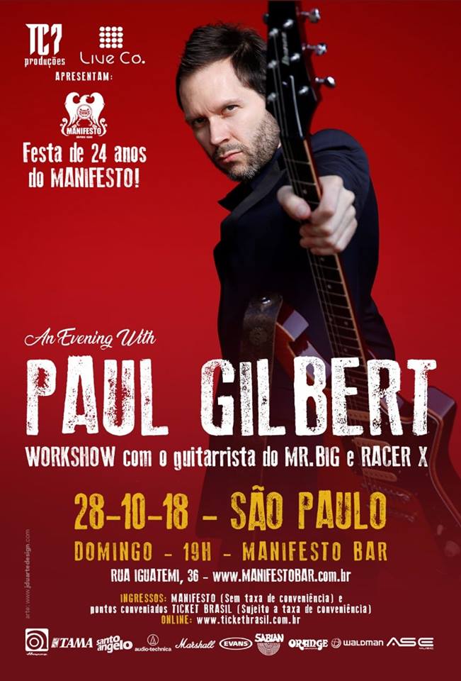 No dia 28/10 (domingo), Paul Gilbert se apresentará no Manifesto Bar (Rua Iguatemi, 36, Itaim Bibi – São Paulo). Na ocasião ele fará um workshow, com direto a Jam com fãs e músicas de sua carreira (solo, Mr. Big, Racer X, etc. )