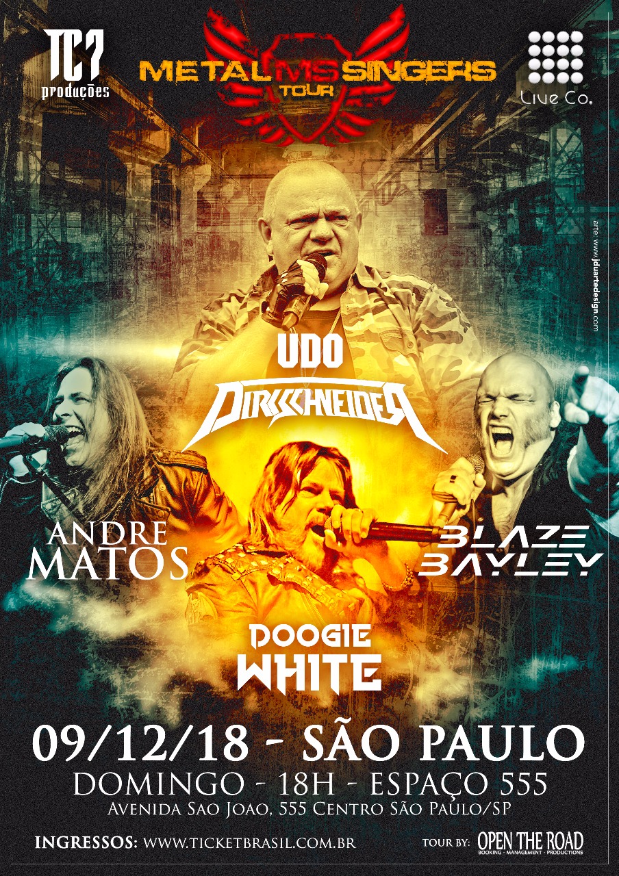 A segunda edição do projeto “Metal Singers” acontece neste Domingo, 09/12, no Espaço 555 (Av. São João, 555, Centro, São Paulo – ao lado da Galeria do Rock). Devido ao enorme sucesso da primeira edição (em 2015), o projeto está de volta, dessa vez com os remanescentes, Udo Dirkschneider (U.D.O., ex-Accept), Blaze Bayley (ex-Iron Maiden) e dois novos participantes; André Matos (Shaman, Viper e ex-Angra) e Doogie White (Michael Schenker’s Temple Of Rock, ex-Rainbow, ex-Tank, ex-Pink Cream 69, ex-Yngwie Malmsteen, etc...).