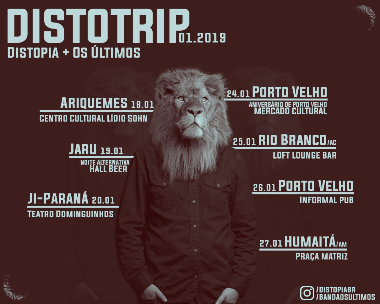 A banda de Rock Alternativo Distopia, de Porto Velho/RO, divulgou sua agenda de shows para o mês de janeiro com a banda Os Últimos, confira abaixo: