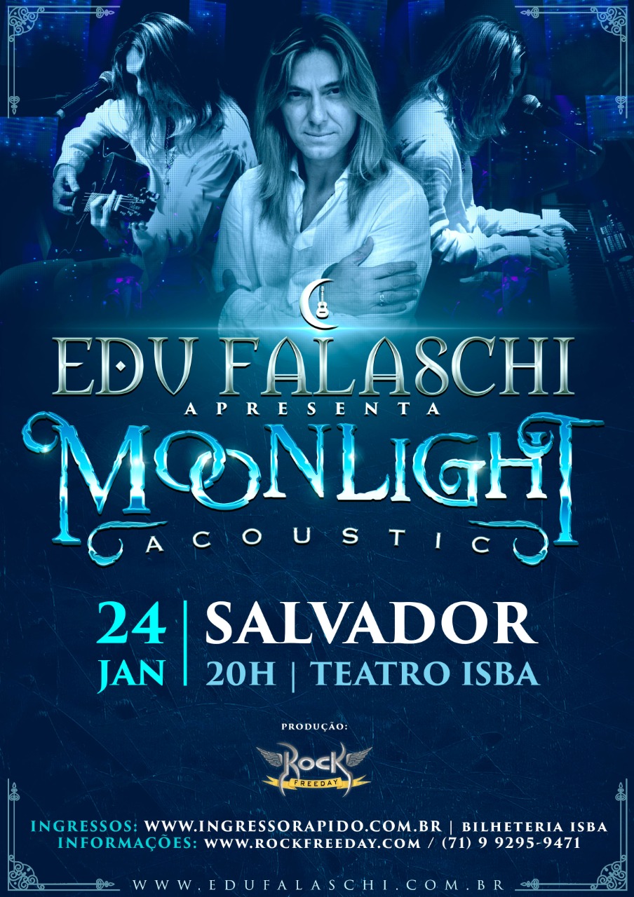 O incrível cantor, multi-instrumentista, compositor Edu Falaschi, ex-vocalista da banda Angra e renome internacional, está sempre em busca de novos desafios. O músico acaba de anuncia para o início de 2020 uma surpreendente turnê ACÚSTICA do seu projeto intitulado MOONLIGHT CELEBRATION.