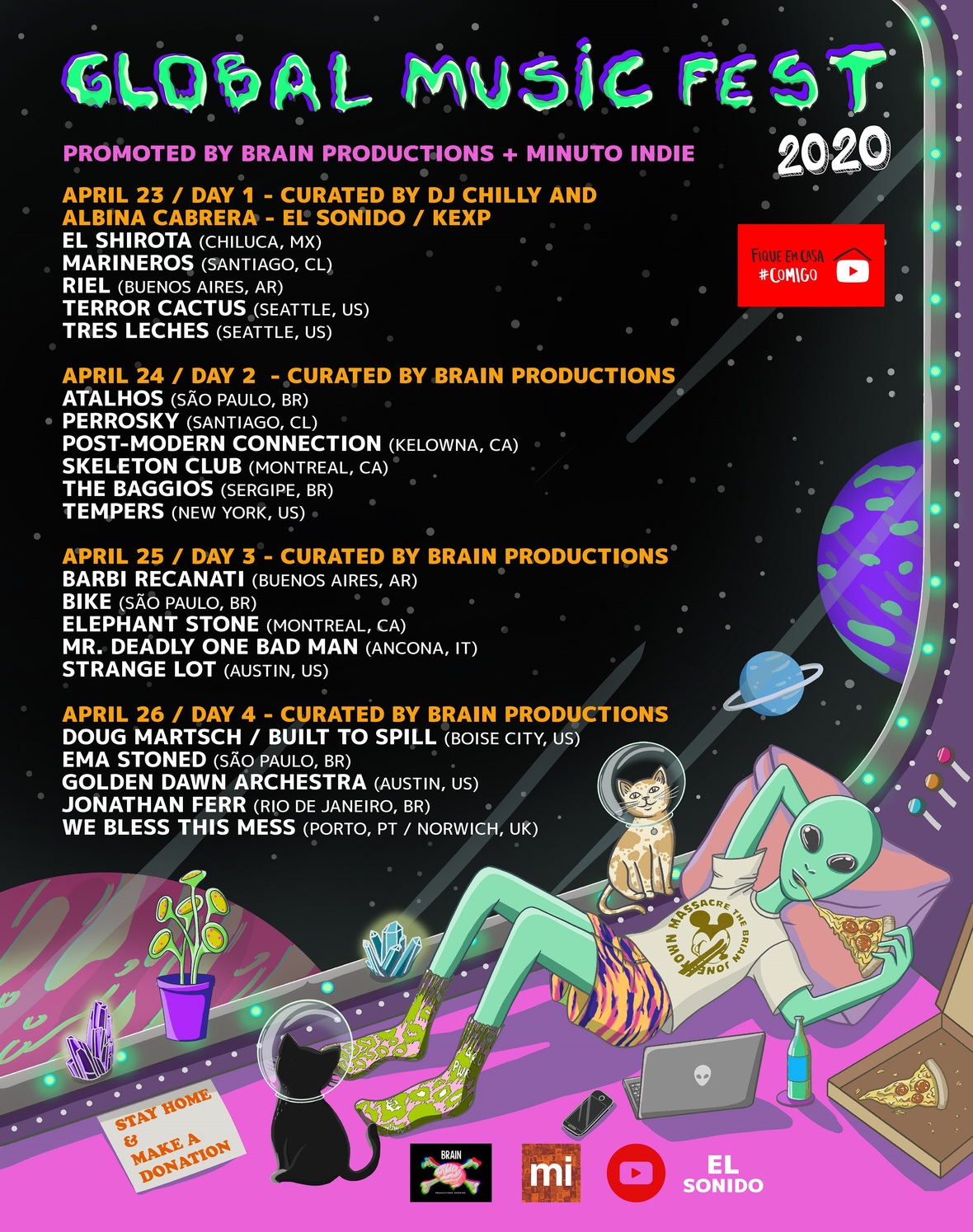 Durante o necessário isolamento social para conter a disseminação mundial da Covid-19 (novo coronavírus), o manager artístico Carlo Bruno Montalvão, da Brain Productions Booking, idealizou um festival online com um formato inédito, além de rigorosamente profissional e, o mais importante, beneficente. É o Global Music Fest 2020, que acontecerá de 23 a 26 de abril, com transmissões inéditas no canal do Youtube do Minuto Indie, com 20 bandas da cena alternativa de 8 países diferentes. O Festival é uma parceria inédita da Brain Productions Booking e do canal Minuto Indie, por meio de seus idealizadores, Montalvão (Brain) e Alexandre Giglio (Minuto Indie).
