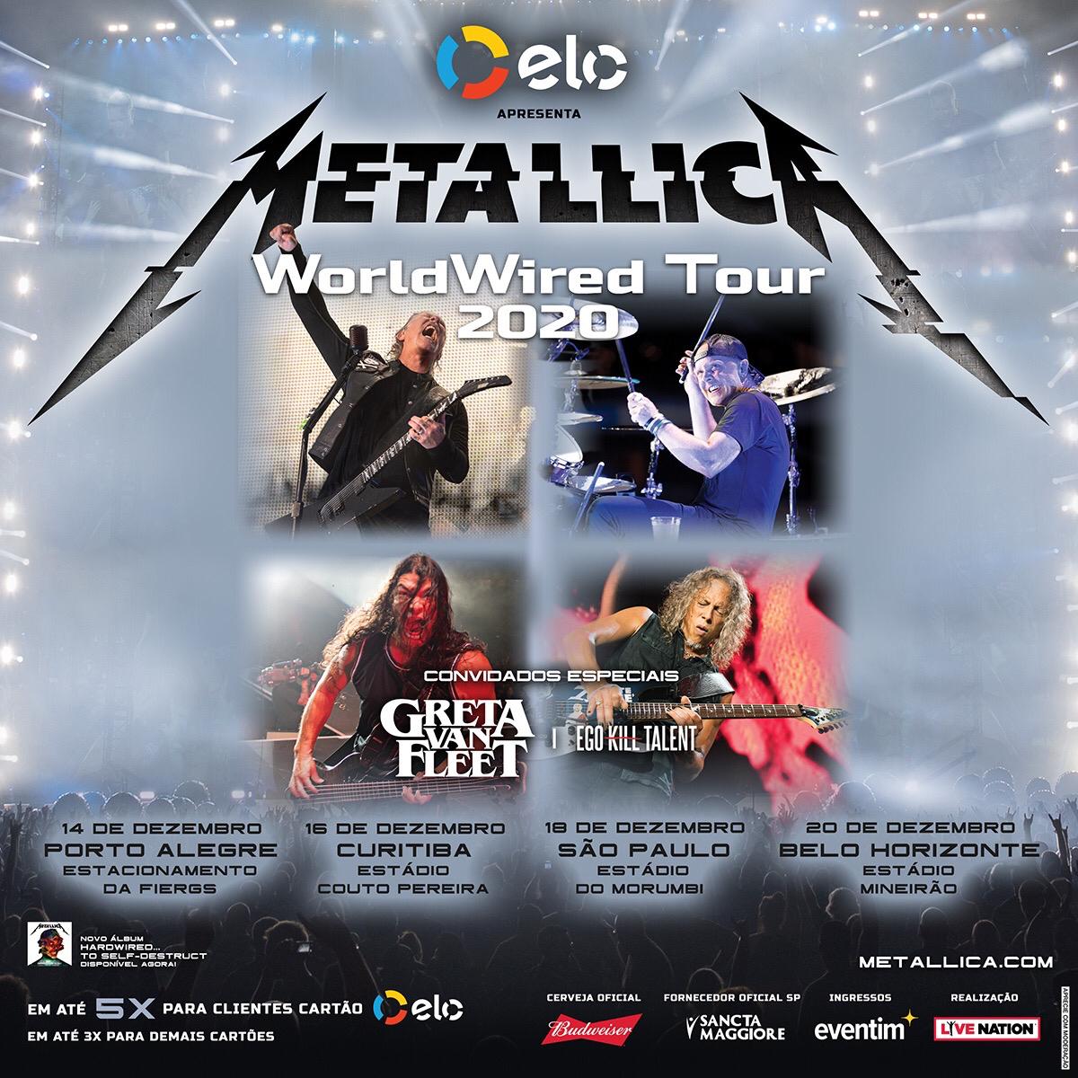 Os shows acontecerão em Porto Alegre (14/12 - Estacionamento da FIERGS), Curitiba (16/12 - Estádio Couto Pereira), São Paulo (18/12- Estádio do Morumbi) e Belo Horizonte (20/12 - Estádio do Mineirão). Mais informações em https://www.eventim.com.br/metallica em breve.