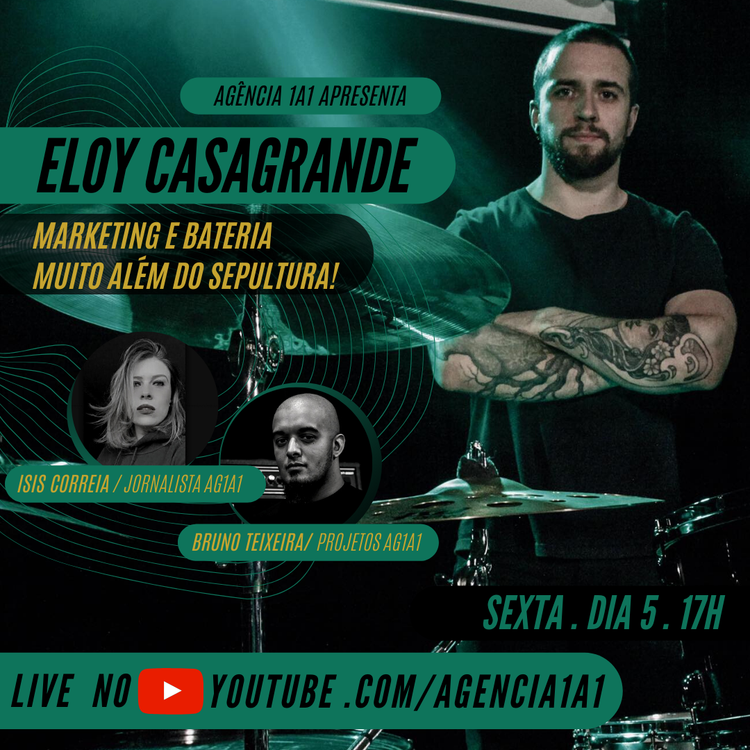 O baterista Eloy Casagrande é o convidado dessa sexta-feira (5) da Agência 1a1 para um bate papo ao vivo no YouTube. A pauta é marketing musical para além do Sepultura esmiuçando o trabalho que o músico desenvolve fora da banda com seus workshops, em sua série de aulas chamada 'Bateria para Subversivos' e agora na era do disco Quadra. A sobrevivência da imagem do artista em tempos de quarentena e formas de bateristas desenvolverem suas divulgações também serão assunto.
