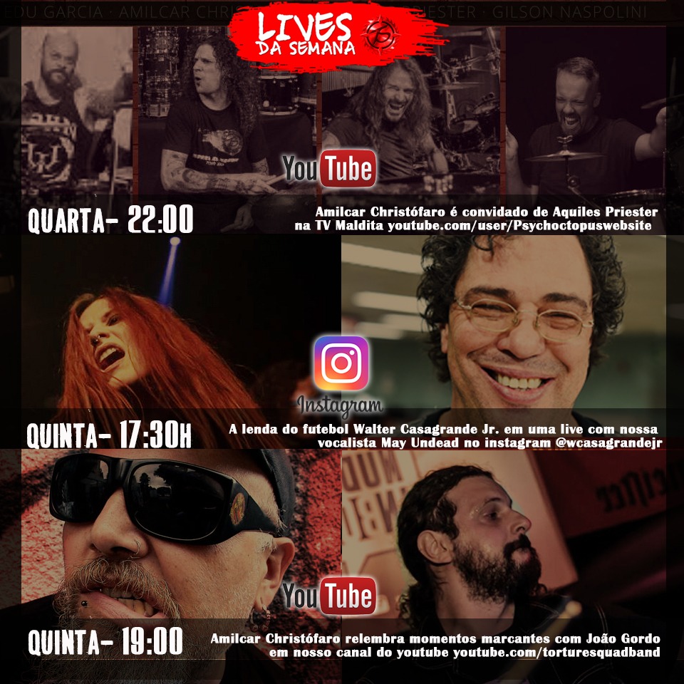 A partir desta quarta-feira (10), grandes personalidades vão bater um papo com o Torture Squad nas Lives que a banda vai promover e participar nos canais parceiros durante a semana. Abrindo os trabalhos, o baterista do Torture Squad, Amilcar Christófaro, conversa com o parceiro de baquetas Aquiles Priester que comanda o papo com outros grandes nomes do instrumento, Edu Garcia e (John Wayne / One Arm Away) e Gilson Naspolini (As The Palaces Burn / O Mundo Analógico) nesta quarta. A roda de conversa acontece no canal do YouTube do Aquiles Priester, a partir das 22 horas.