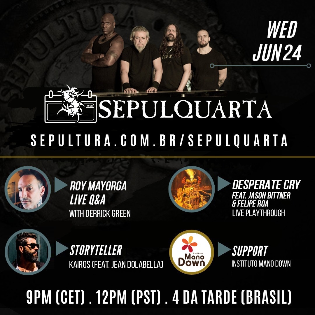 Em mais uma semana da série SepulQuarta, do Sepultura, a banda recebe no próximo dia 24 de junho, a partir das 16h15 (horário de Brasília) Roy Mayorga, baterista do Stone Sour para a live Q&A com o vocalista Derrick Green. "Conheço o Roy desde os tempos em que morei no LES (Lower East Side), bairro de Nova York. Compartilhamos muitos amigos em comum da cena e tivemos o prazer de tocar juntos ao vivo no palco várias vezes. Temos muito que conversar e relembrar de momentos incríveis."